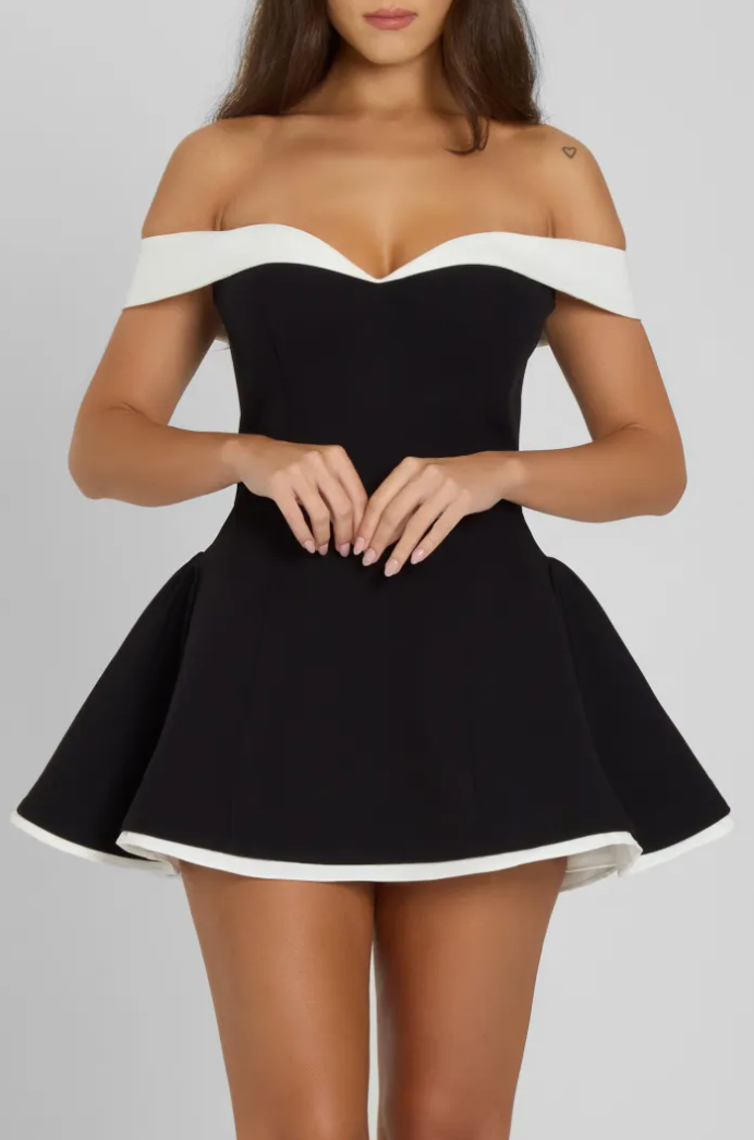 Dieses Minikleid mit kontrastierendem Schwarz-Weiß-Korsett ist das Symbol für raffinierten und mutigen Stil. Die perfekte Mischung aus Sinnlichkeit und Raffinesse macht es ideal für jeden Anlass, bei dem Sie auffallen möchten. Das enge Korsett betont die Silhouette, während der kurze Rock einen Hauch unwiderstehlicher Weiblichkeit verleiht.